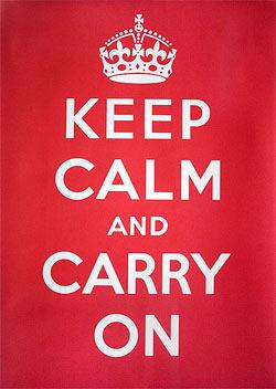 Η φράση αυτή, που έχεις οπωσδήποτε δει σε αφίσες και φλιτζάνια και avatars στα Ίντερνετς, ήταν γραμμένη σε μια αφίσα του 1939 και απευθυνόταν στον Αγγλικό λαό (μαζί με άλλες αντίστοιχες, όπως “Freedom is in peril -defend it with all your might”) για να του χαλυβδώσουν το φρόνημα, ή κάτι τέτοιο. Λεπτομέρεια: Οι συγκεκριμένες αφίσες δεν χρησιμοποιήθηκαν ποτέ, η συντριπτική τους πλειοψηφία πολτοποιήθηκε, και έπρεπε να περάσουν περισσότερα από 60 χρόνια για να βρει κάποιος μια από τις εναπομείνασες και να την κρεμάσει σε ένα βιβλιοπωλείο του Λονδίνου.