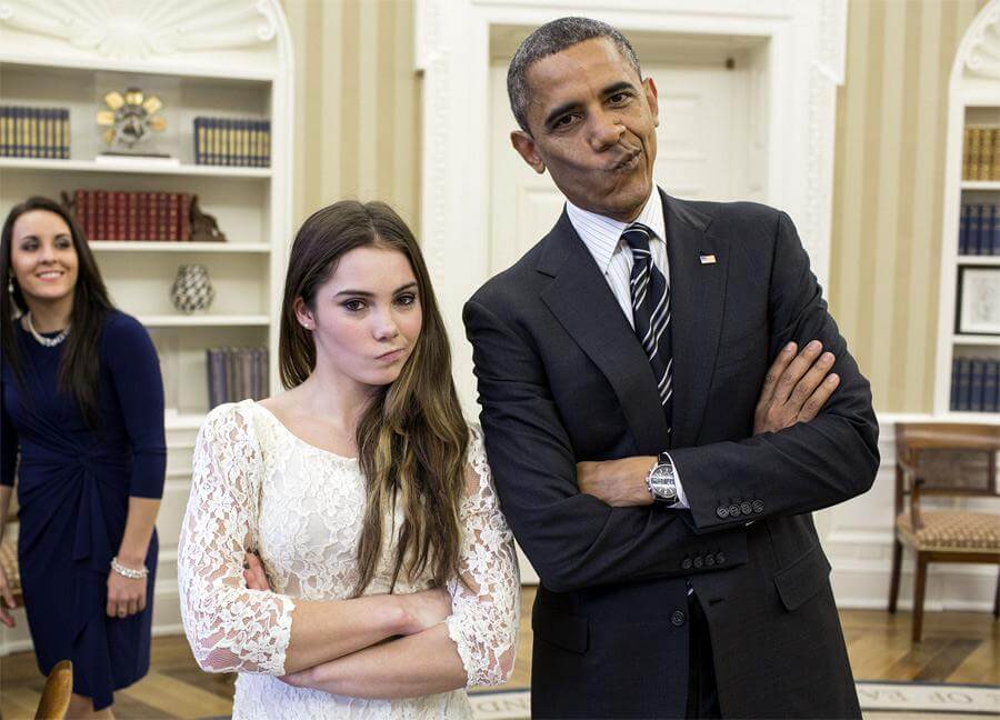 Και ο εναγκαλισμός με τα memes συνεχίστηκε αξιοθαύμαστα. Όταν η αμερικανική εθνική ομάδα γυμναστικής επισκέφτηκε το Λευκό Οίκο, ο Ομπάμα γνώρισε την Μακέηλα Μαρόνη, της οποίας η ξυνισμένη φατσούλα όταν πήρε μετάλλιο ασημένιο αντί για χρυσό στο Λονδίνο είχε γίνει διάσημη: