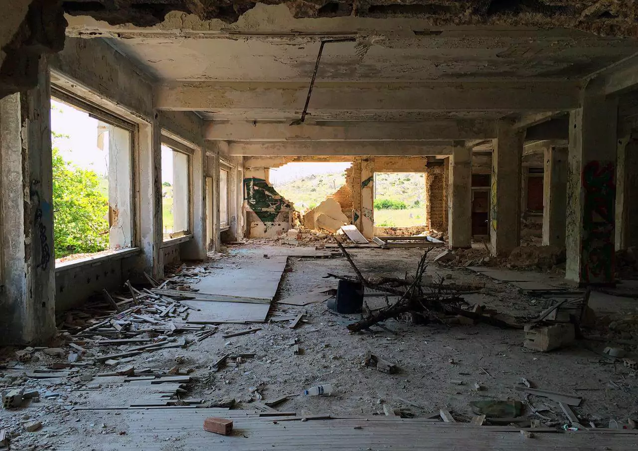 Είναι πενταόροφο και θυμίζει νοσοκομείο ή ξενοδοχείο, κάτι πολύ μεγάλο πάντως, που κάποτε φιλοξενούσε πολλούς ανθρώπους στα πολλά και ευρύχωρα δωμάτια.