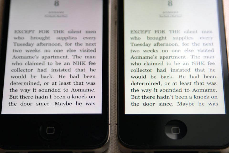 Μικρή διαφορά αλλά εμφανής και, απ’ ό,τι έχω διαπιστώσει, συνηθισμένη και ενδεικτική της ατελούς φύσης της βιομηχανικής παραγωγής στα εργοστάσια της Foxconn (ή οποιασδήποτε βιομηχανικής παραγωγής οπουδήποτε, εδώ που τα λέμε). Κάνε ένα πείραμα: Μάζεψε από το χώρο στον οποίο εργάζεσαι ή βρίσκεσαι όλα τα iPhones και βάλτα δίπλα δίπλα. Βάλε τέρμα φωτεινότητα σε όλα. Κατάλαβες τί εννοώ; Κάπου διάβασα ότι η κιτρινίλα στις οθόνες των φρέσκων iPhones οφείλεται στη ρητίνη με την οποία κολλάει το γυαλί, και η οποία γίνεται πιο διαφανής και άχρωμη καθώς περνάει ο χρόνος.
